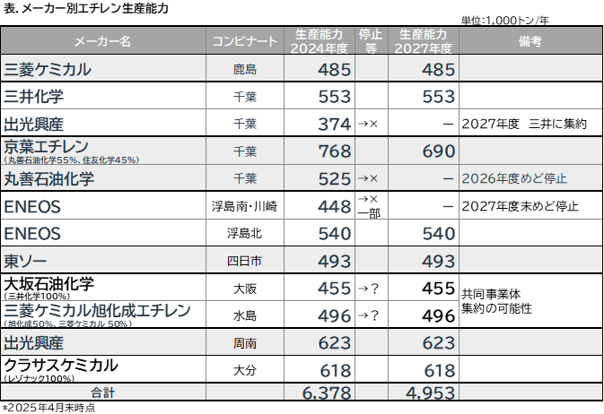 メーカー別エチレン生産能力